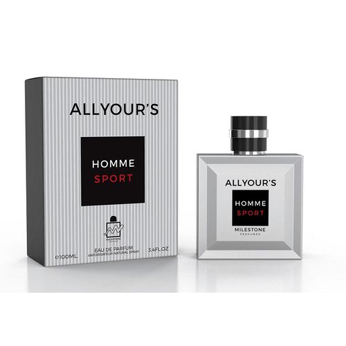 Introducing All Yours Homme Sport , the luxurious and long-lasting fragrance that exudes a sense of regal elegance.   MILESTONE All Yours Homme Sport (Pour Homme) HEAD NOTES : Mandarin Orange, Mint, Cypress and Sage HEART NOTES : Pepper BASE NOTES : Tonka Bean, Musk, Sandalwood, Cedar
